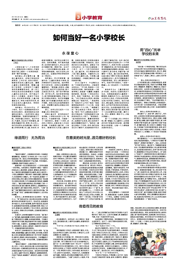 “校长是一个学校的灵魂。”陶行知先生的这句话点明了校长在学校发展中的重要地位。作为农村偏远乡镇学校的校长,我认为,要做好农村小学尤其是偏远乡镇小学的领头人,必须具备“四心”,即爱心、责任心、进取心和平常心。