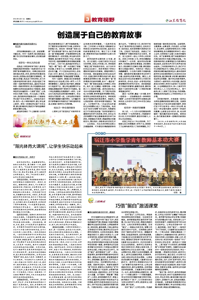时间“留白”,让学生自主。时间是师生在有限的课堂时间里共同完成教学活动的第一要素。教学是师生双边信息传输与互动活动,只有留出合理时间给学生支配,才能让学生自主学习。时间“留白”,教师要做到“三戒”:一戒全,即备课时,教师要有明确的教学目标和重点,要结合学生实际,紧紧围绕教学中心,脉络清晰,重点突出,切不可为片面追求大而全,无形增加学生负担;二戒满,即教学过程中,既要考虑教师“教”的时间,更要充分考虑学生“学”的时间,尊重学生个性差异,合理调节教与学的进度,使教学相长,切不可为追求大容量、快节奏而“满堂灌”“满堂讲”;三戒快,教育是慢的艺术,课堂上时常会遇到学生思维卡壳或表述不全的现象,教师为求教学进度往往会失去耐心,殊不知这些正是教育的资源与契机,只要多给学生一点耐心和等待,就会点燃学生思维之花。