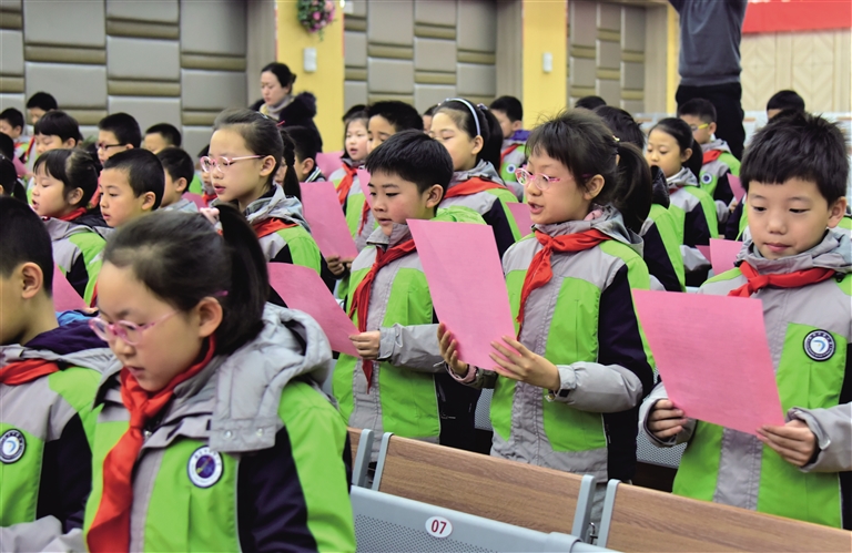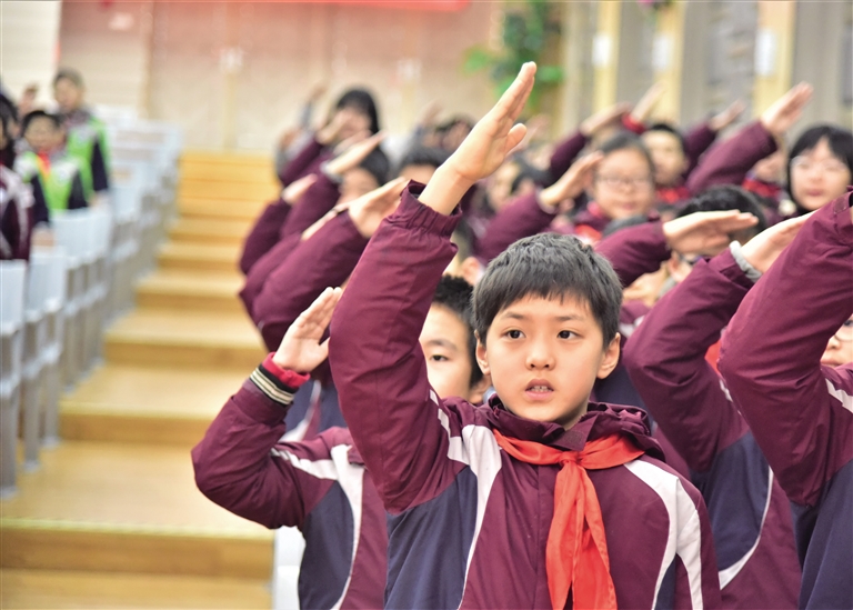 12月4日是国家宪法日。当天9点,教育部在北京设立主会场,举行以“弘扬宪法精神,厚植爱国主义情怀”为主题的全国中小学生宪法晨读活动。省教育厅在南京市力学小学设立分会场,通过教育部全国青少年普法网与主会场实现连接。图为力学小学学生与全国青少年一同参与升旗仪式,观看宪法晨读直播,跟读宪法部分条款。
