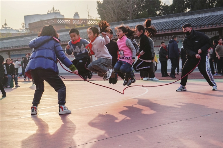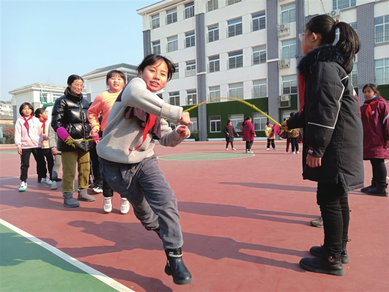 近期,天气寒冷,淮安市纪家楼小学积极开展踢毽子、跳长绳等冬季阳光体育运动,增强学生体质,锻炼学生意志品质。图为12月24日该校举行跳绳比赛场景。