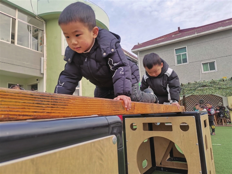 为深入贯彻《3-6岁儿童学习与发展指南》精神,切实加强幼儿体格锻炼,盐城市潘黄幼儿园将冬季户外活动纳入游戏范畴,组织“玩转户外,乐享运动”主题活动,锻炼幼儿体质,增强幼儿应对冬季流感等疾病的抵抗力。图为小班孩子正在玩木梯闯关游戏。 卞桂富摄