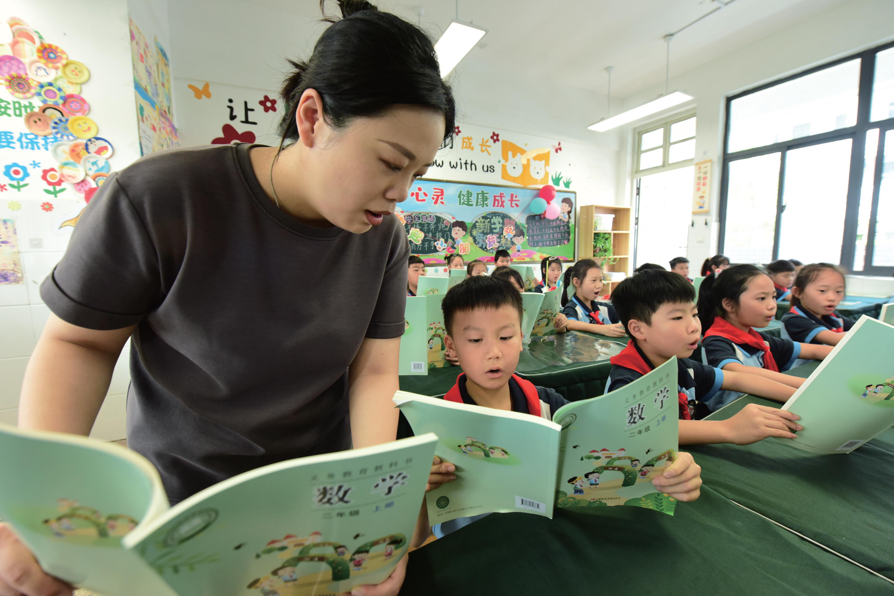 图⑤:8月31日,东海县实验小学滨河校区教师带领学生阅读新课文。