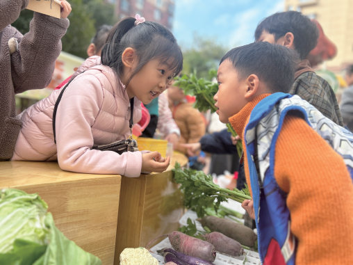 11月9日,新沂市“教联体”家园互动“金秋博览会”开幕,社会爱心人士、家长代表与教师一起引导孩子们体验生活,学习知识。图为孩子们在“农科院”进行专业实验,在“菜市场”开展售卖活动。