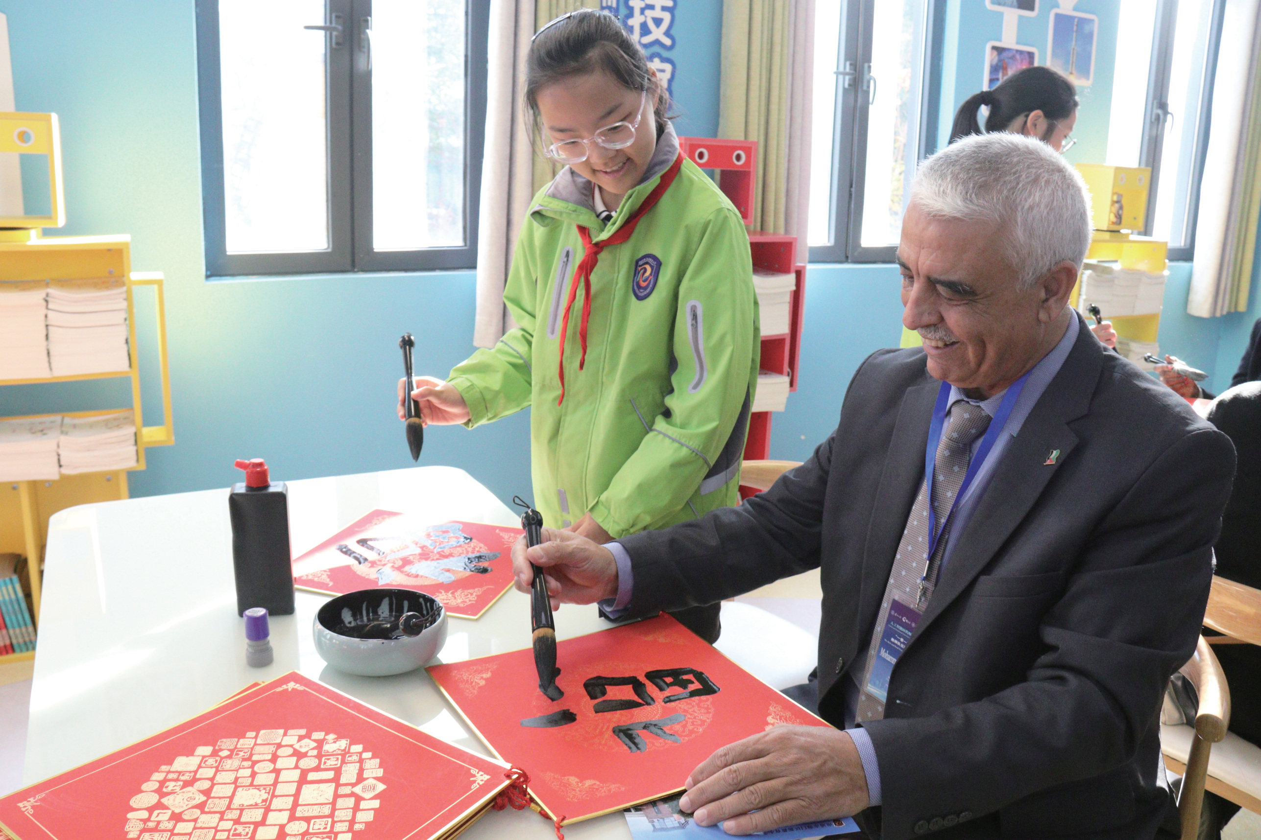 图为“一带一路”共建国家教师队伍建设国际研讨班外国友人在江苏省南通市海门区新教育小学参与书法活动